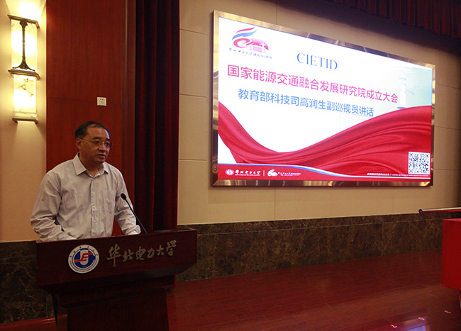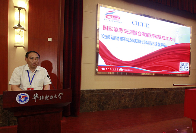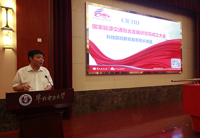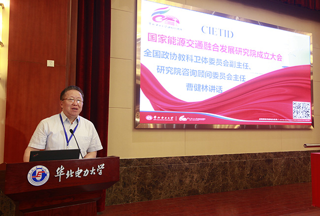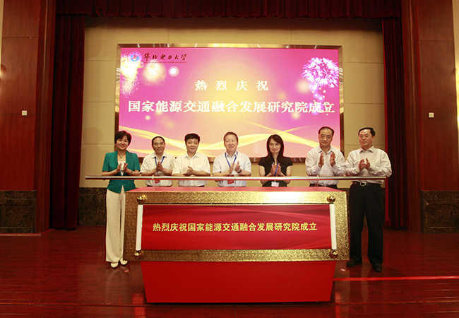 研究院成立会上,莅临学校参加会议的十三届全国政协教科卫体委员会副主任曹健林、科技部高新司司长秦勇、国家能源局科技司副司长唐艺艳、交通部科技司副巡视员郑代珍、教育部科技司副巡视员高润生与我校党委书记周坚、校长杨勇平,共同为国家能源交通融合发展研究院成立揭牌。